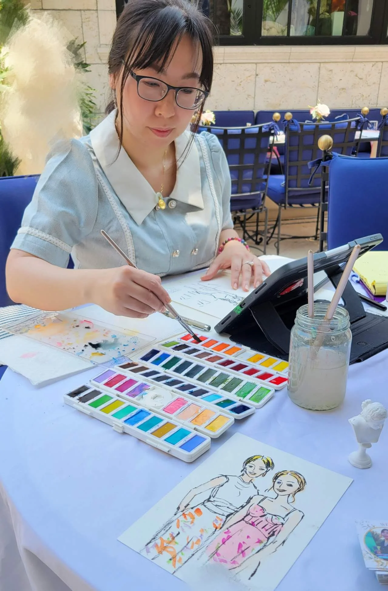 A woman with glasses painting watercolor artwork of two women in dresses at a table outdoors.