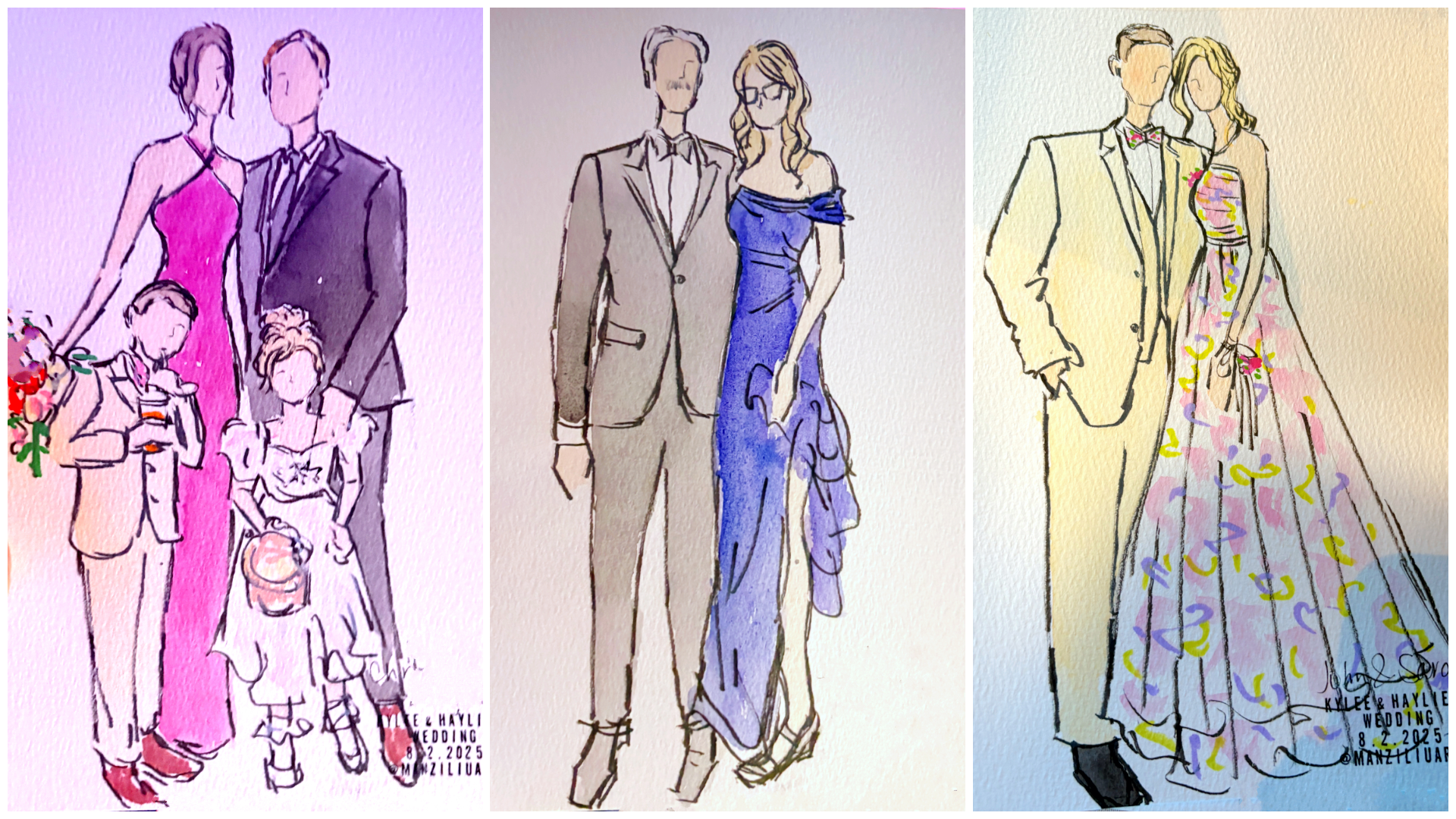 I saw live guest portrait illustrations trending on Instagram and just knew I had to have it at my wedding. After doing some research online, I found Manzi, and let me tell you—she’s AMAZING! I’m so glad I booked her. What sets her apart? First, she’s a professional artist with a real art degree, and she’s been doing this as a career for a while, not a hobby artist.
